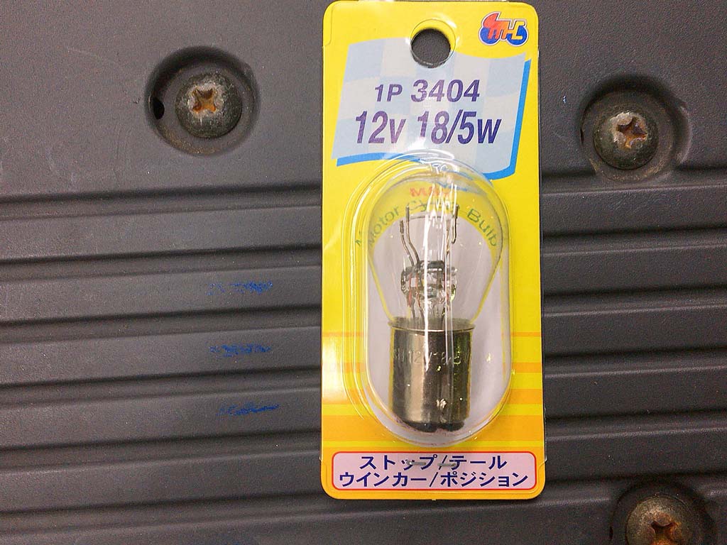 仕方ないのでエンジンを切って押して帰って、部屋からドライバーを持ってきてテールランプのカバーを外して電球を外して型番っていうか買うべきものが何かを確認しつつ、外した電球をデコピンしてみると中でビーンって言ってるのでやっぱり切れてるっぽい。