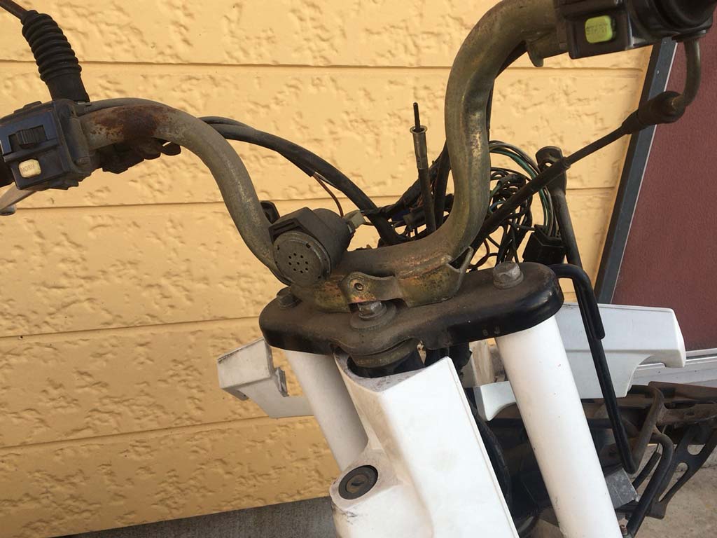 ハンドルは良くあるスクーターのY字じゃなくてハンドルから生えたボルト2本でトップブリッヂに固定されている。