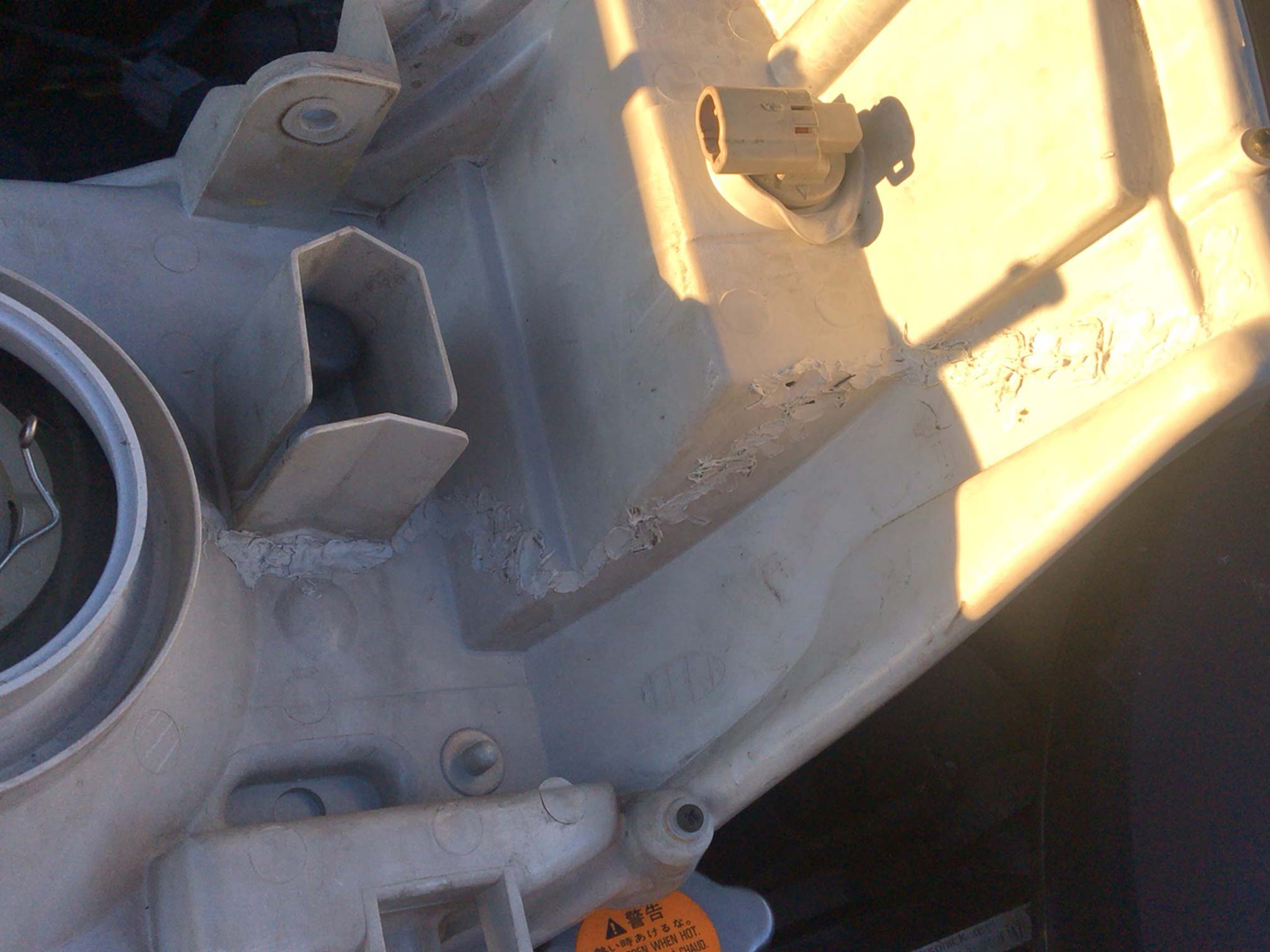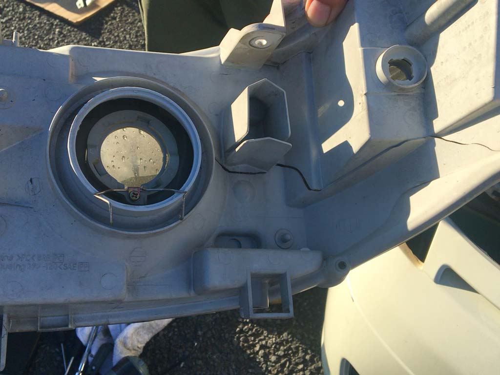 ちょっと判りづらいですけども、ヘッドライトのバルブの穴から右にほぼ一直線にバックり割れてるのが発覚。