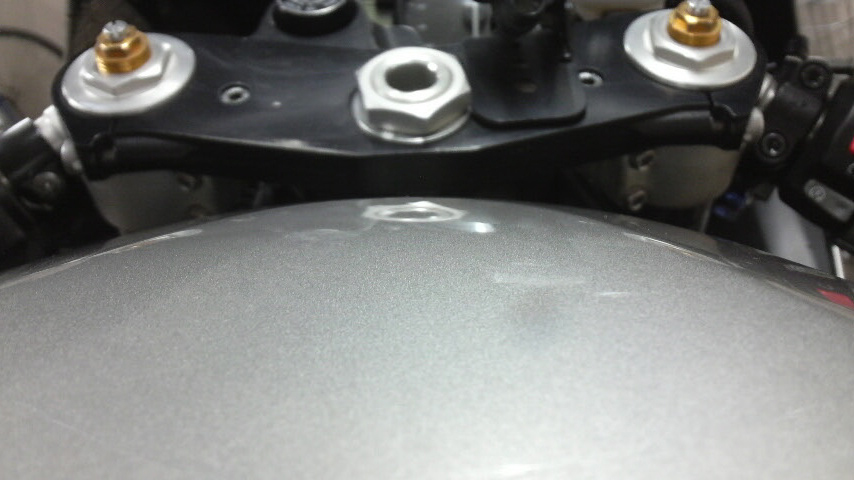 シートカウルなんかノーマルが粉々になった時にタイミング良くヤフオクに激安で出てたクレバーウルフのをポチっとして、届いてみたらペンキを筆で塗ったような酷い塗装だったのが気にいらなかったんで適当に剥がしてそのままっていう勢いだし、アッパーカウルの左側は割れてパカっとなってたトコを裏からFRPで繋いでそのままならタンクの傷もそのままだ。