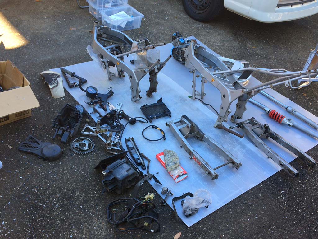 ひとまずざっと使いそうなパーツを集めてどっちのフレームを使うか、スイングアームはどっちを使うかを検討中の図。