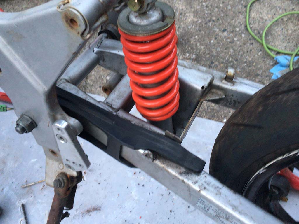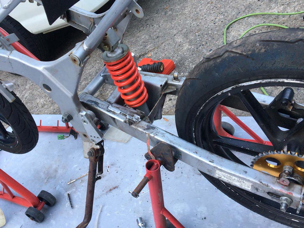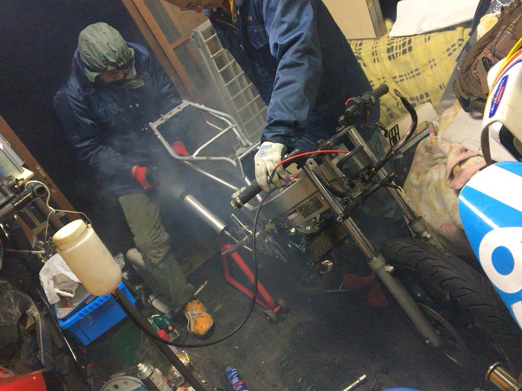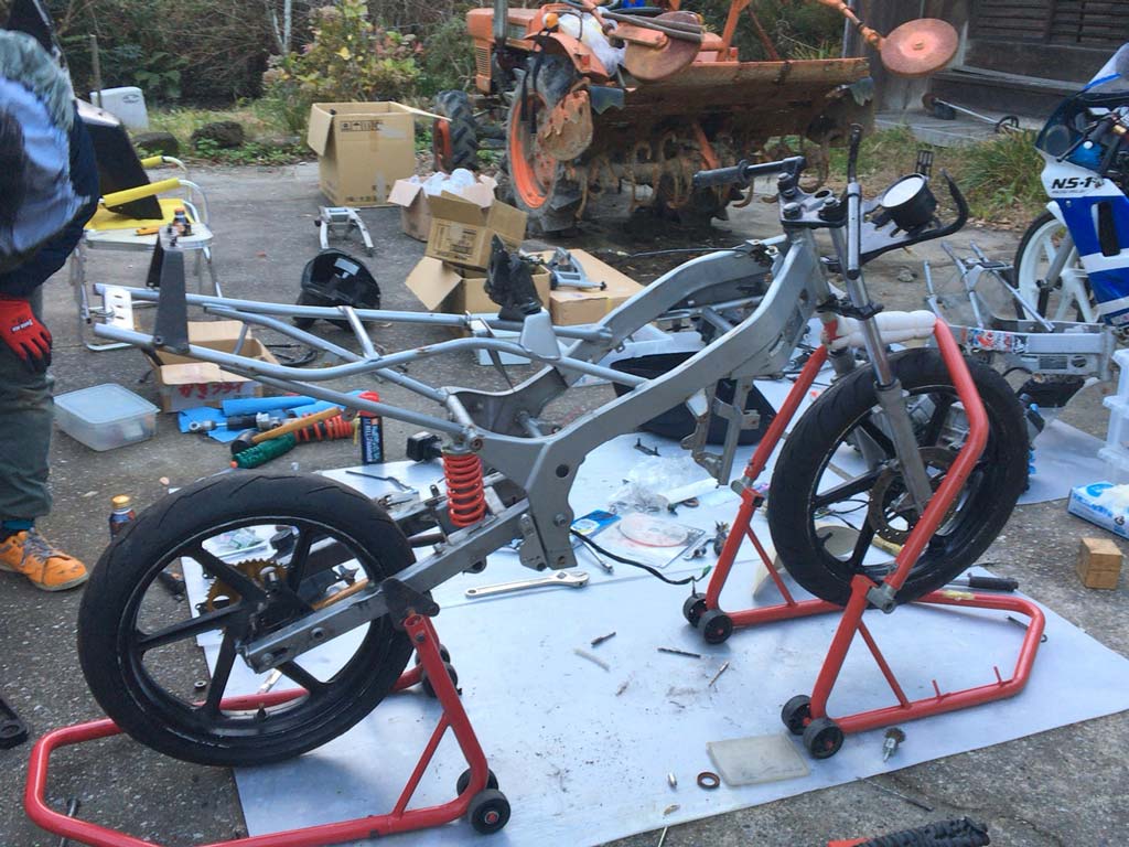 サスやらタイヤやら、タラヲさんの主力NS-1のと組み替えたりなんかしつつジワジワと作業が進むのだけども、タラヲさんともひさんがフロント周りをやっつけてる間にスイングアームの辺りは僕係だった。