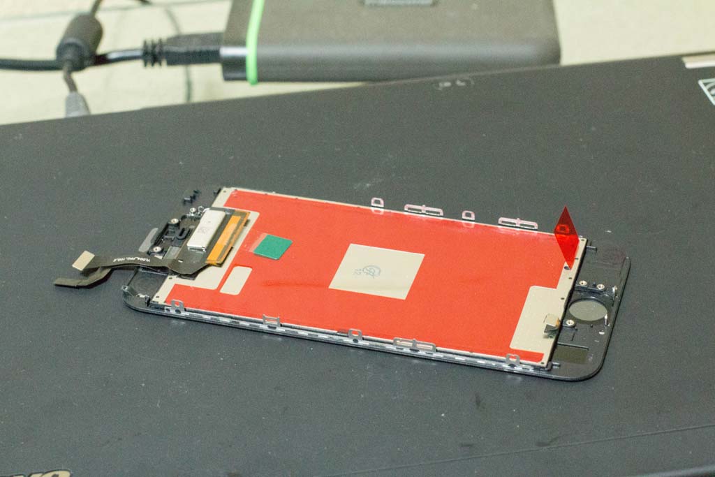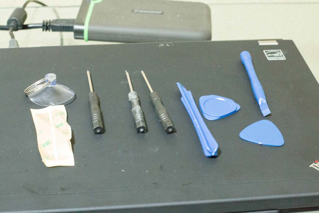 ライトニングケーブルのポートの左右にある星形のボルトを2本抜いて吸盤でフロントパネルを剥がすらしいのだけども、何しろ割れているので吸盤が力強くくっつかねぇ…orz