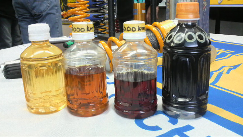 左から新品ー5000kmー10000kmー30000km走ったフォークオイルの状態だそうで。