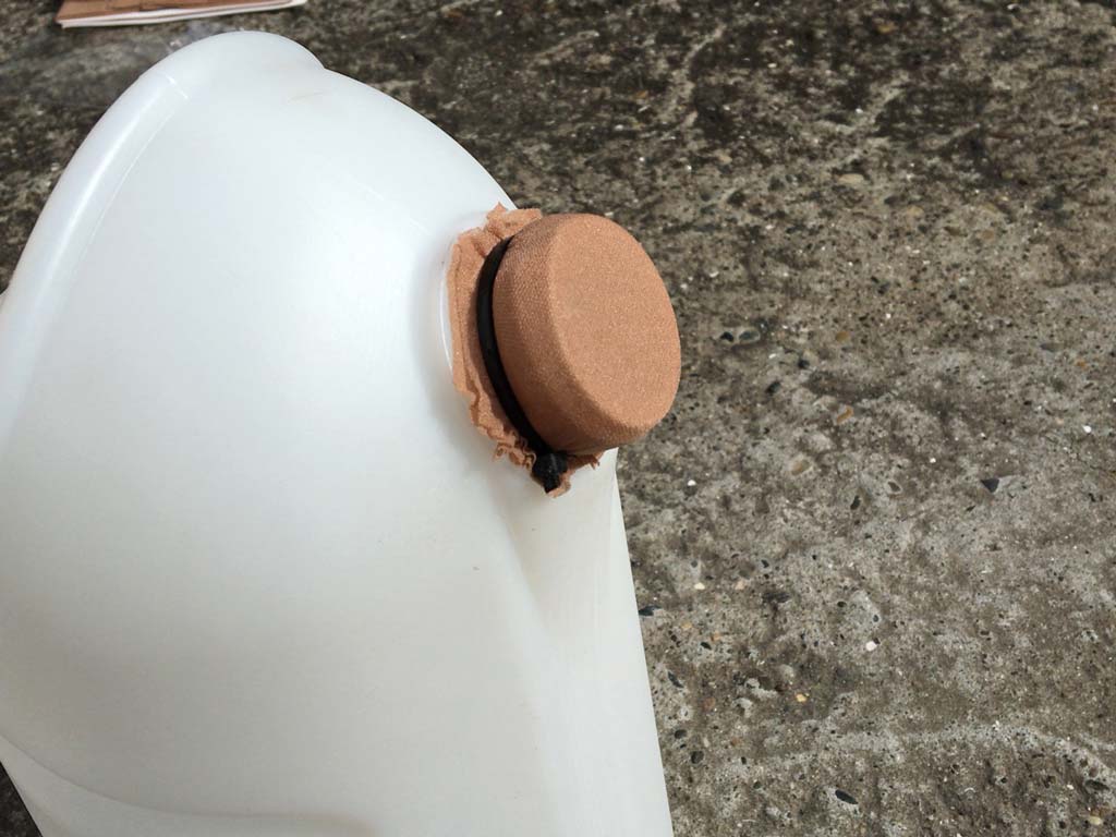 これまでは適当な大きさに切ったストッキングを咬ませてノズルを着けるだけだったのだけど、今度のジョウゴは大きさがちょっと大きいのとノズルが長いのとで、ノズルを外してしまっておきたいので、ノズルを外したジョウゴ本体側に固定しておくことにした。