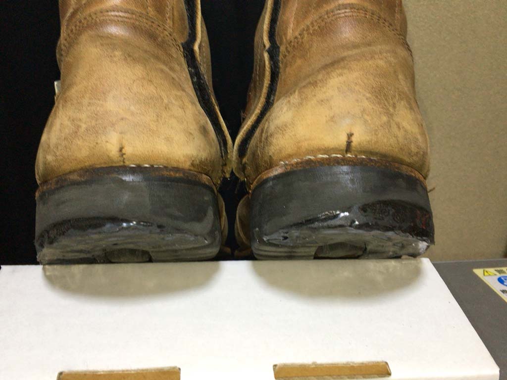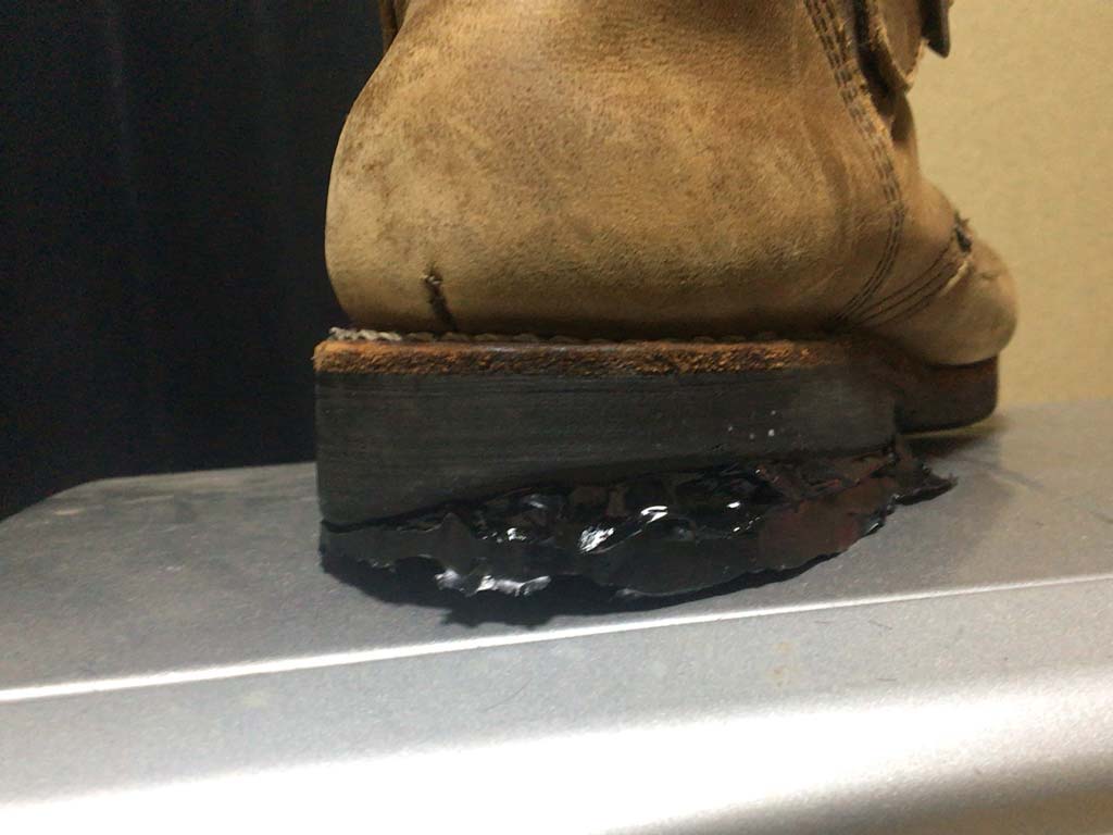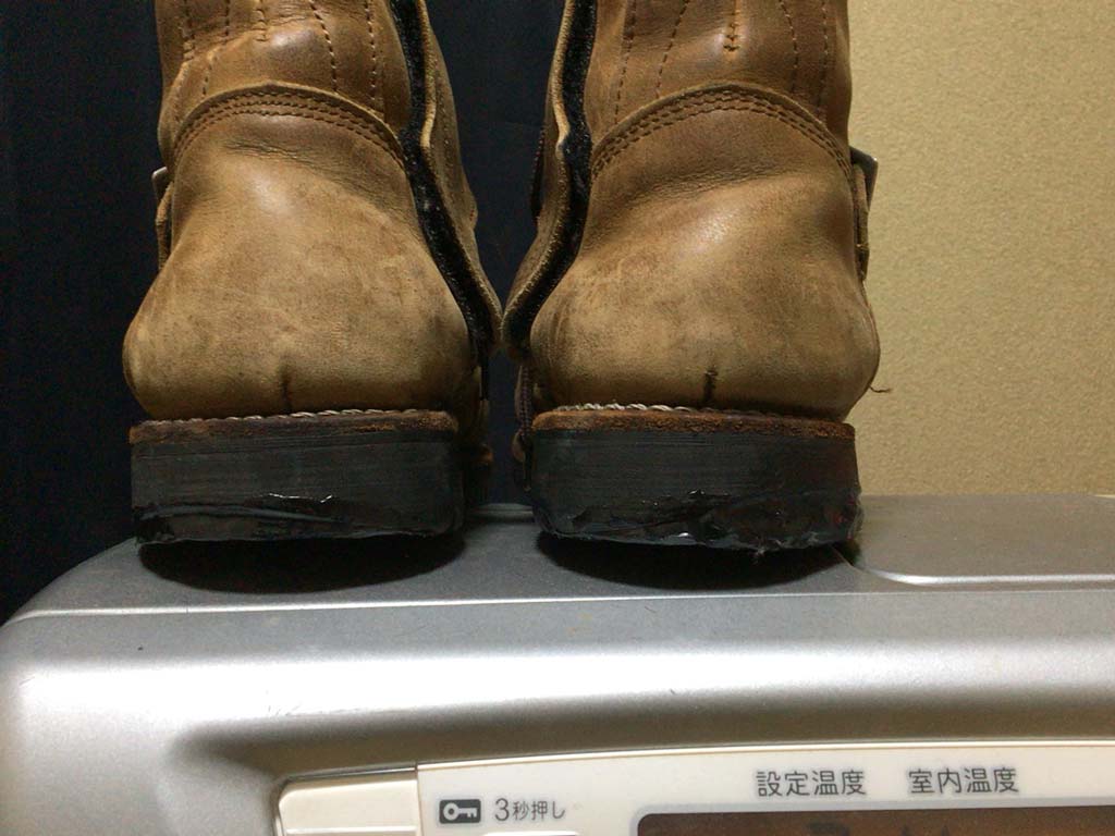 艶のある黒い部分はSHOE GOOを塗りっぱなしの部分で、元の踵の側面よりも盛り過ぎていたところは一緒に削ってあるんですけども、SHOE GOOは削ると元のブーツの踵と同じような落ち着いた色と質感になることが判ったりして。