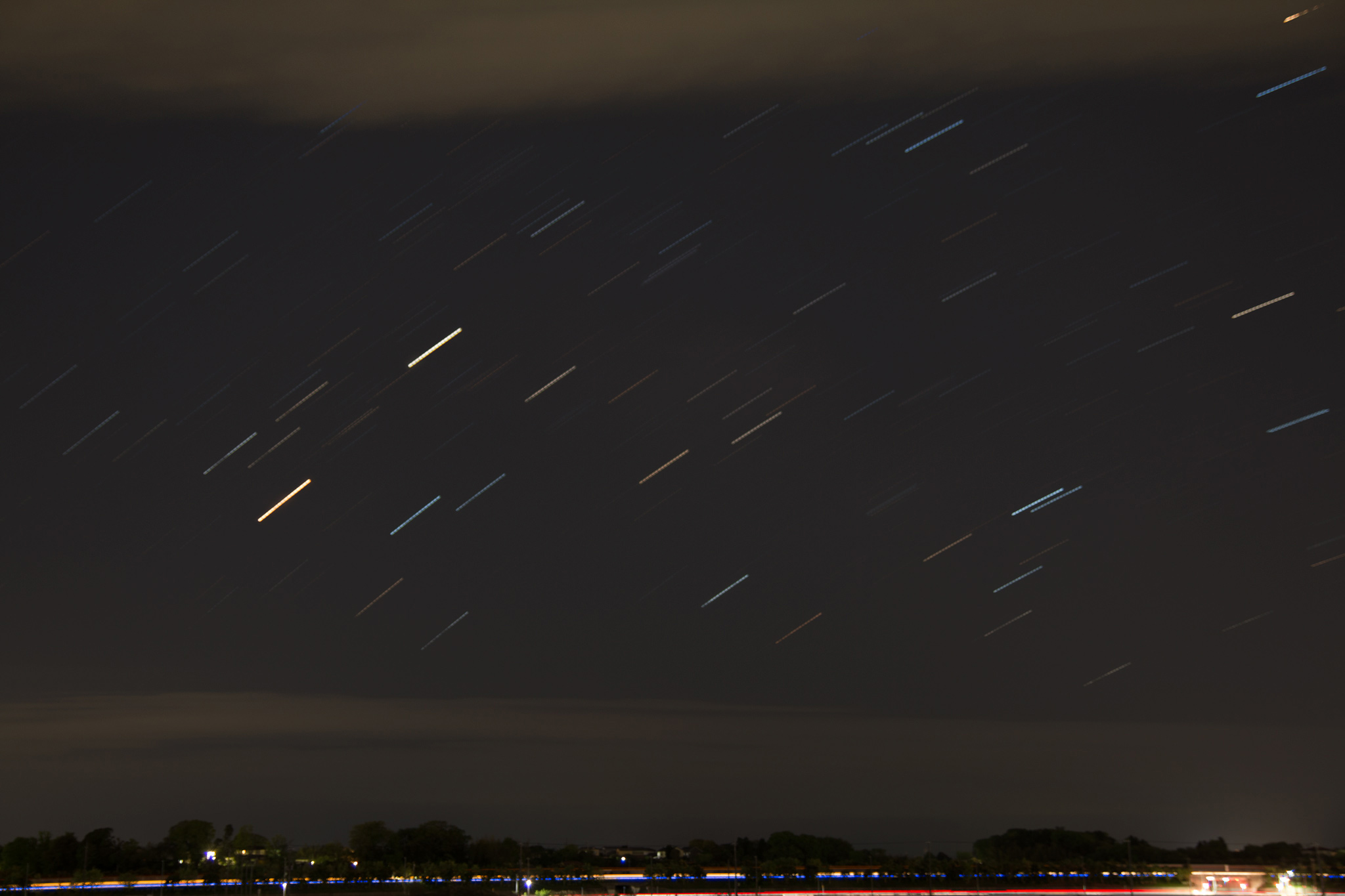 そのくらい物凄いスピードで地球がブン回ってるってことなんですけども、30秒ずつ撮った写真をフォトショップのレイヤーにバラバラに取り込んで比較(明)で合成すると星が繋がった写真になる、と。