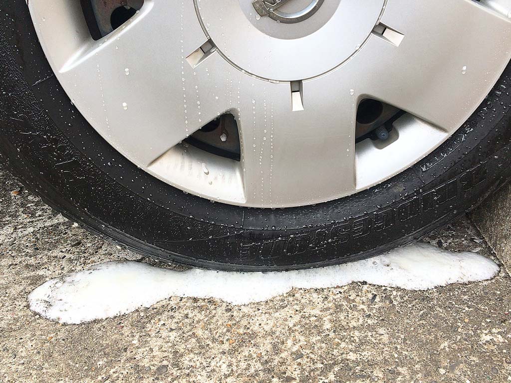 この写真だと判りづらいけど、下に滴り落ちた泡の表面に、タイヤに付着していた泥の色の汚れが浮いていたので、汚れを落とす力はこっちの方があるようだ。