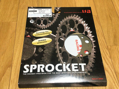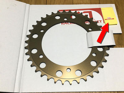 ISAのスプロケって、ない丁数ってのはちょっと時間掛かるけど作ってくれるっていう噂で、今回もそういうノリだったんだと思うんですけども、そのせいかスプロケに貼ってあるちっこいステッカー。