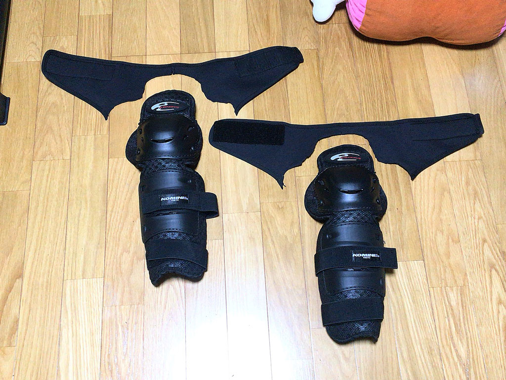 で、左右の脛2箇所ずつをベルトで留めて、これだけだと膝は固定されていないのでプロテクターはプラプラしてるんですけども、ツナギを着てみたら想像していた通り脛だけとまってれば問題なく着られたし、ツナギの膝の裏に勝手にプロテクターのカップが収まるので膝のバンドを外してもまったく問題なかった。