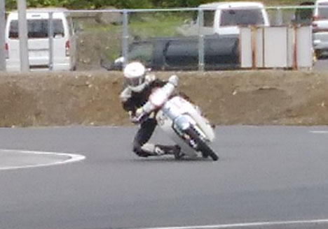 僕としてはMollet V100で京スピを走った時も何気にスゲー楽しかったし、同じようなノリでハットリのカブでサーキットっていうのも楽しかろうな…っつぅことで、周囲が耐久レースを楽しんでいる中、結構ムキになってタイムを出しに行ってた(笑)