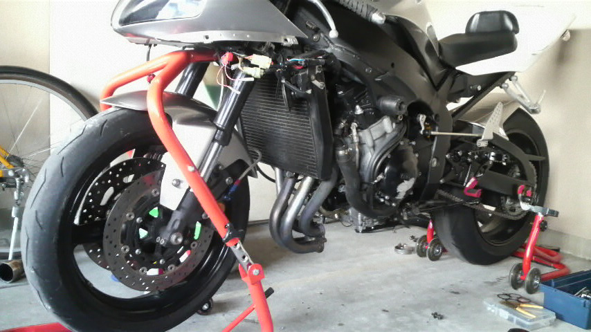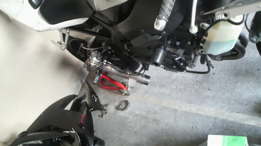 で、色々用意したブツと工具と前後のスタンドを駐輪場という名のガレージに降ろしてカウルを外して、モリワキのスリップオンを引っこ抜いて『さぁやるか!!』って思ったらですね、エキパイを外せねぇ…。
