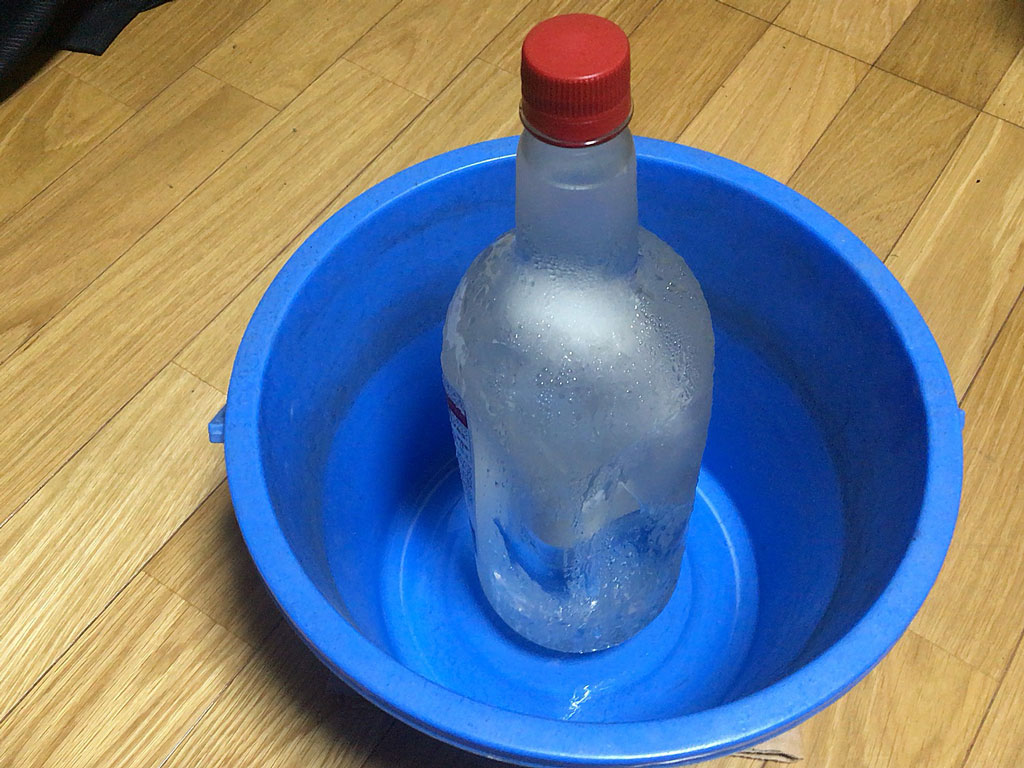 っつぅことで、部屋に転がっていたワインのペットボトルに水を入れて凍らせておいたものをバケツにイン!
