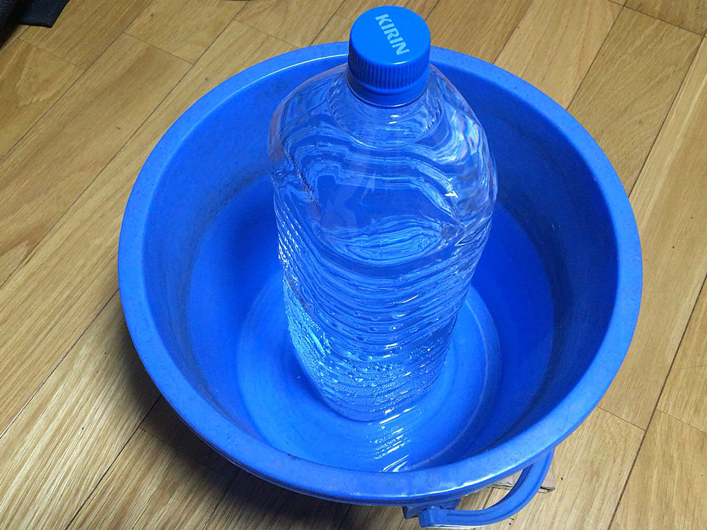 これってのは暑くてジメジメした場所に温度がずいぶん低いものを置いておくと表面が結露して空気中の水分が液体化するっていうことなんだと思うんですけども、そういうことなら氷の容量と表面積が広い方が効果が上がんじゃね!?っつぅことで、表面がちゅるんっとした1.5リッターのペットボトルから、2リッターの水のペットボトルに変えて試して見る。