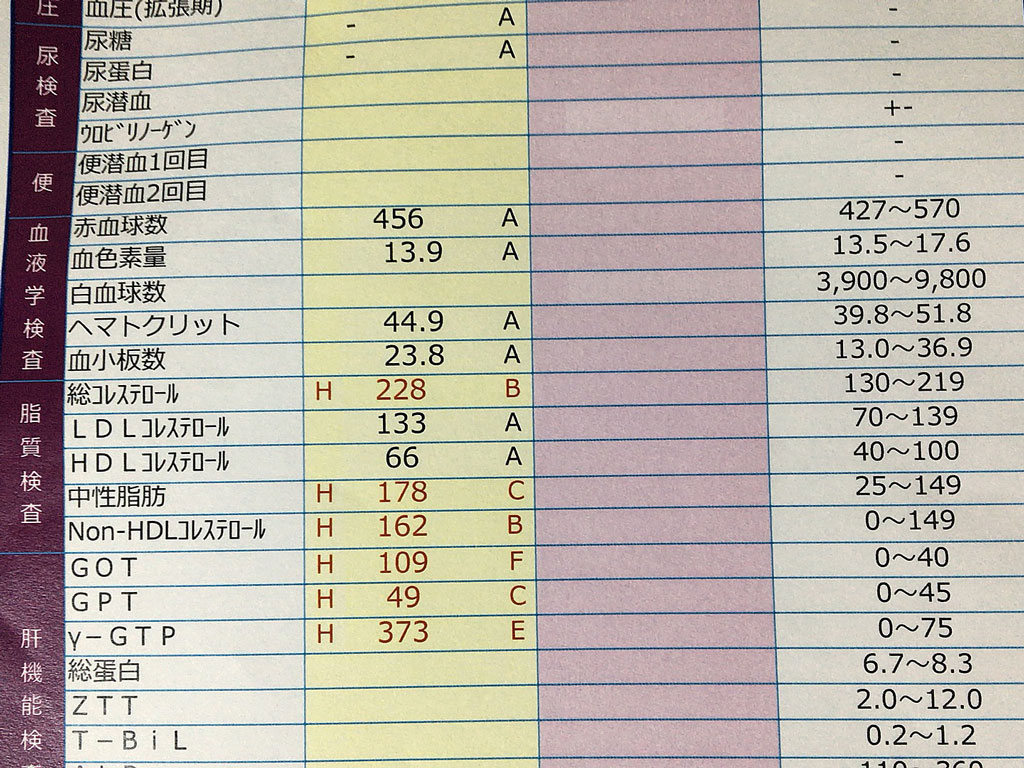 このブログによれば、8年前の7月9日に健康診断の結果について触れてる時には既に標準許容値の3倍あるって話しが書いてあって、それってのはγ-GTPのことなんですけども、その後毎年数値が上がり続けた挙句、確か一昨年かその前の年の時点で4桁行って医者の人に『このままだと5年もちませんよ…?』って言われたんですよね。