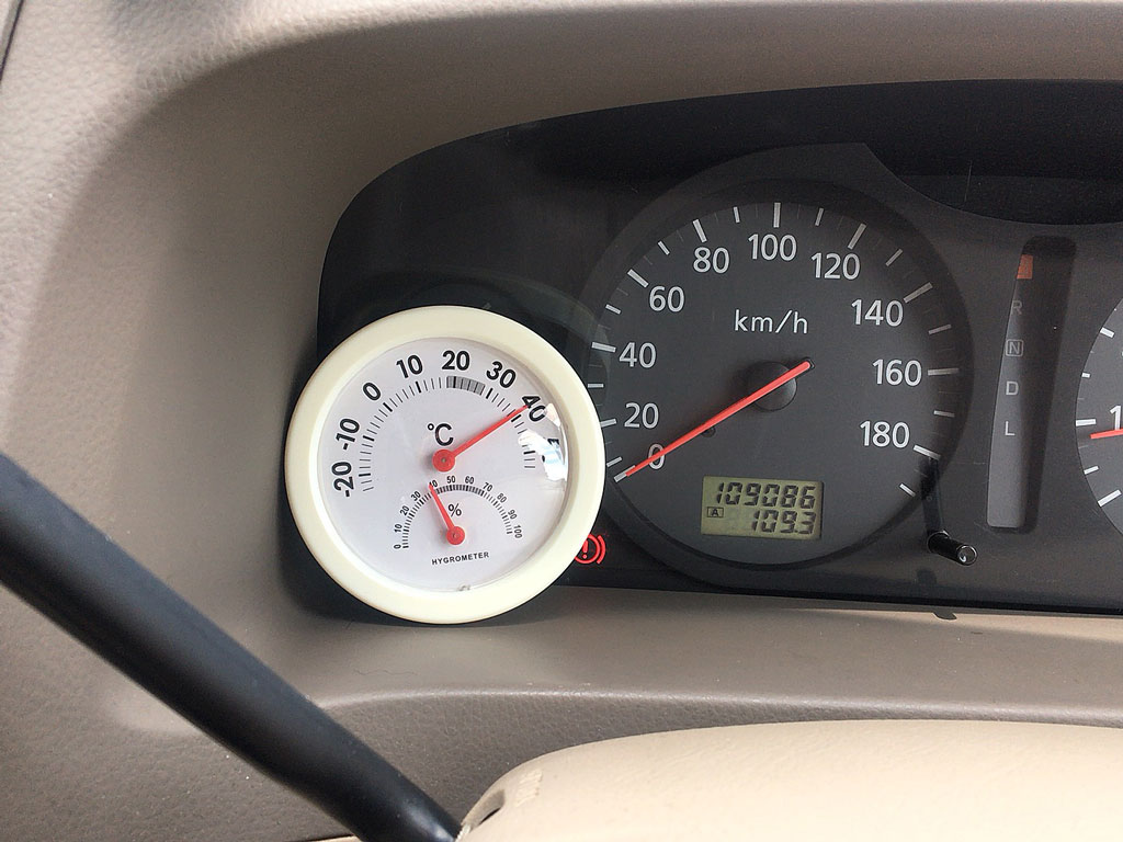 メーターパネル内の直射日光の当たらない場所にその温/湿度計を置いておいたらば…
