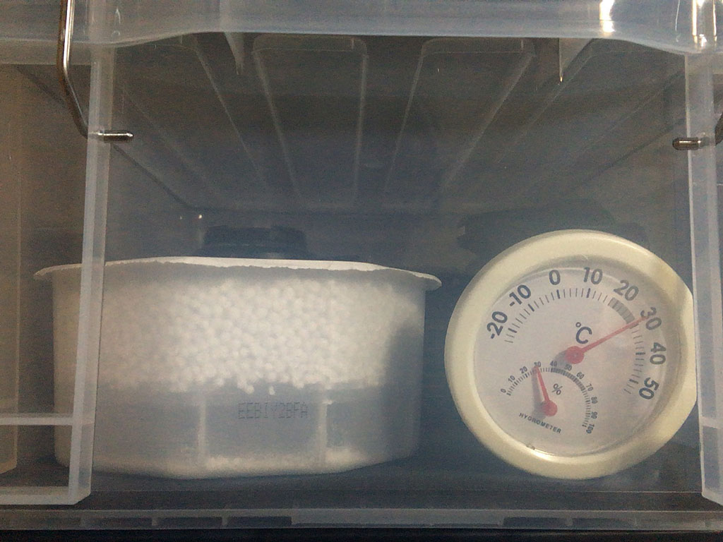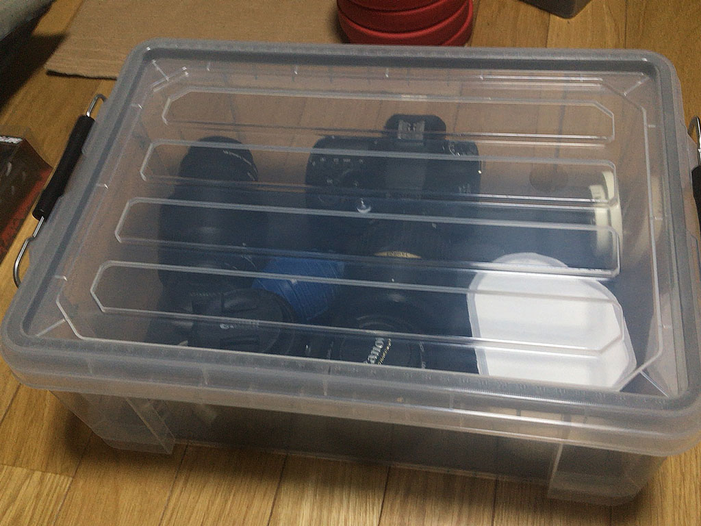 もちろんちゃんとした高価な防湿庫なんてのは手が出ないし、そこまで大仰なものが必要な程の機材も持ってないので、パッキン付きで密閉に近いプラケースに、ドライペット的な除湿のやつと一緒に入れてあるだけなんだけども(笑)