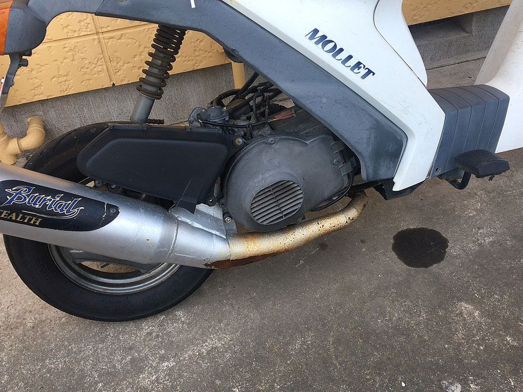 この前の台風の後でそうなったので、マフラーから水が大量に入って中の2ストオイルを垂れ流してるんだろうと思ったんですよね。