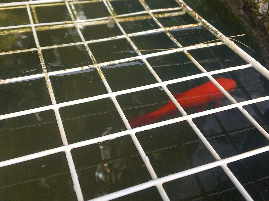 で、お墓といえば手桶に水を汲んだりするのだけど、何か所かある水道のトコに毎年夏には金魚っていうか鯉の小さいのみたいなのが1匹から数匹泳いでいる。