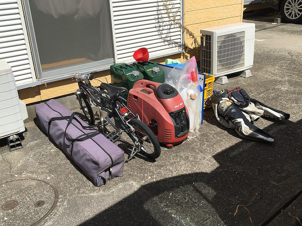 ブーツやプロテクター類をまとめてあるカゴと携行缶2つ。発電機とテントとちゃりはしとツナギ。