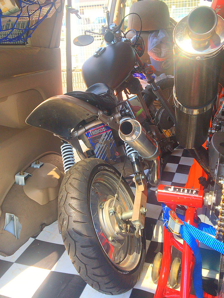 丁度床の板を貼っていない部分にサイドスタンドが立っていたらしく、見る見る内にトランポの床という名の4次元空間にスタンドが吸い込まれていった…。