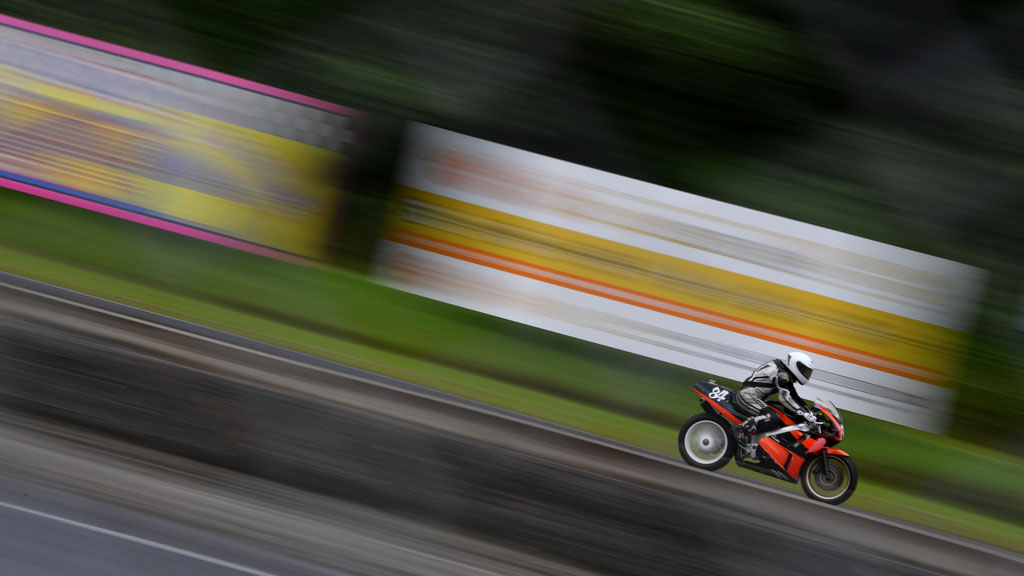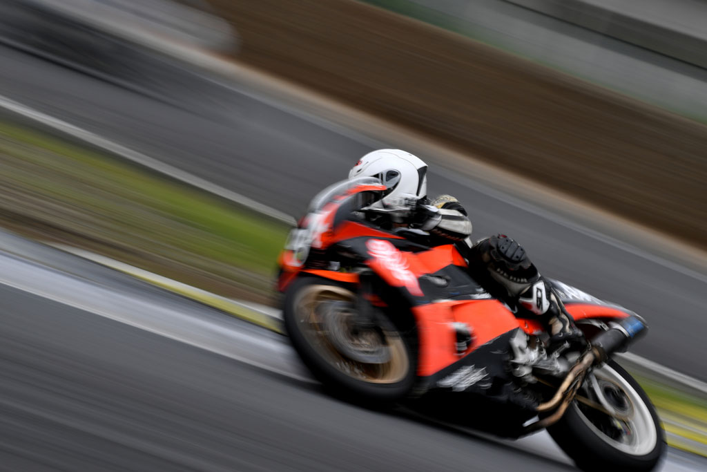 ゼッケンの特に8の辺りのブレ方やフロントタイヤの感じ、流しながらフォーカスリングをいじってるのかな…と思いつつ、それだったら背景のコースももっとそれらしいブレ方になるような気もするし、ヘルメットやバンクセンサーの距離にはブレがないのとか…不思議な写真だ。