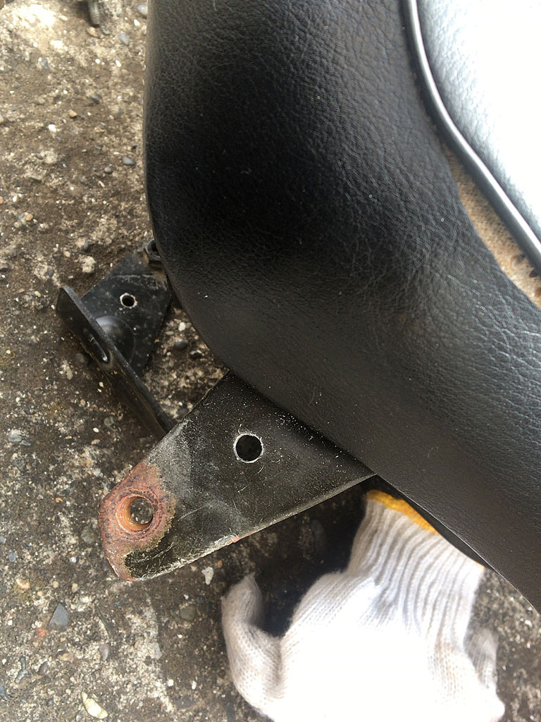 それから、1度ノーマルに戻して見ようと思ってヤフオクで入手したノーマルシートなんですけども、そのステーの穴を活かしてナンバーのステーを留めるように加工していたのだけど、どうやらその穴ってナムさんが開けたっぽくて、ノーマルのステーのその位置には本来穴が開いていない様子。
