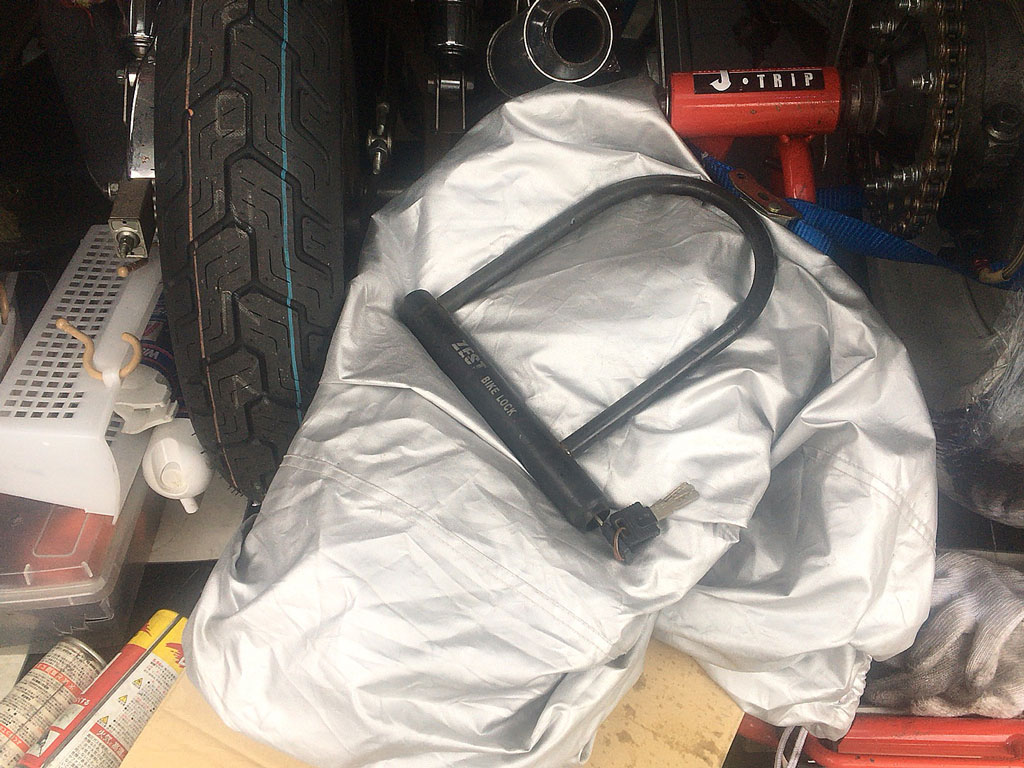 余ってるのあるから持ってって良いよ♪と、バイクカバーとU字ロックをセットでいただいた!