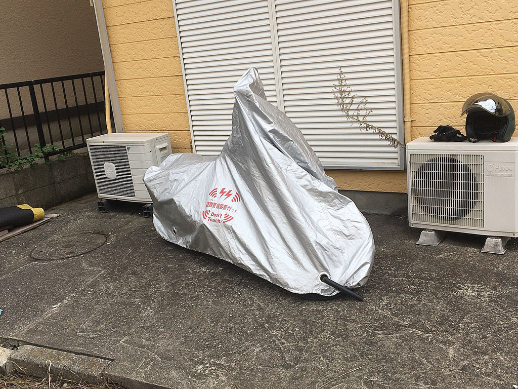 もらってきたバイクカバーが奇跡的な大きさで、Jazzの車長ではパッツンパッツンなので、前だけU字ロックを通しといたらリアタイヤの方はよっぽどの暴風でも吹き荒れない限りは剥がれることもなさそうだ。