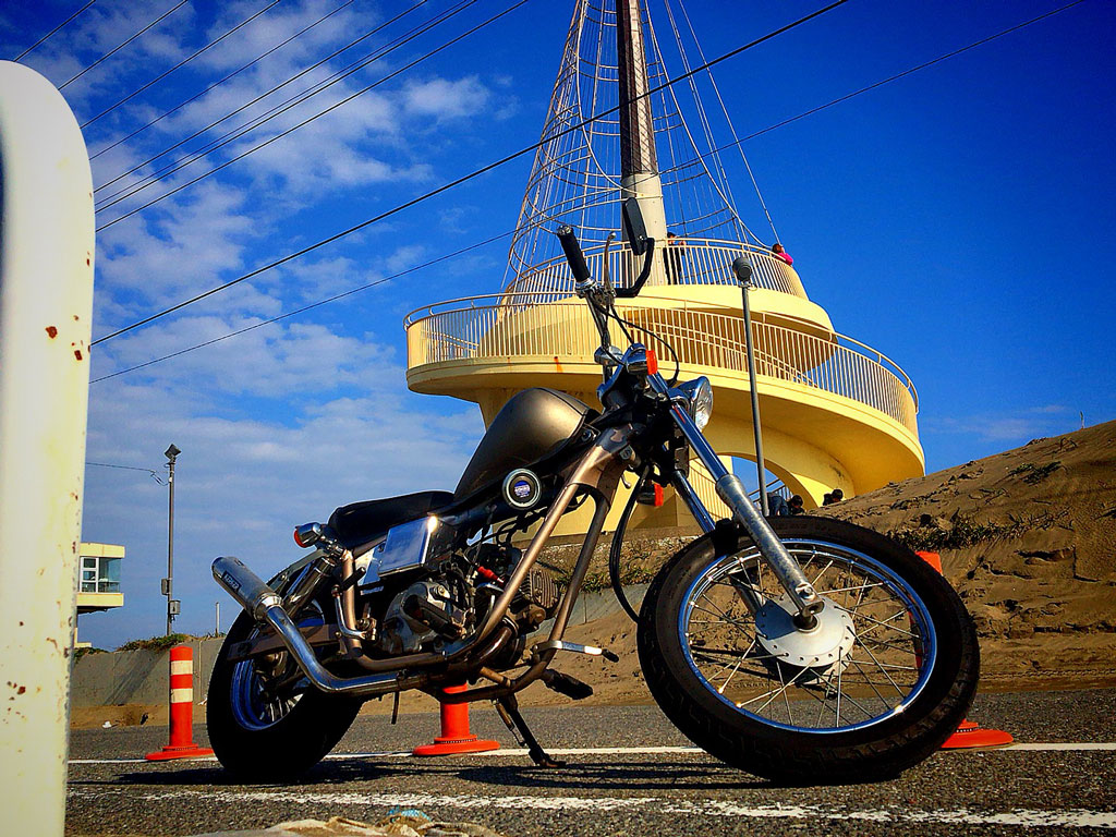 久しぶりに缶コーヒーなんか飲みつつほのぼのしてると、次から次へと実車版キリンみたいな人達がやってきて、『おー、結構タイヤ使ってんね♪どっか山でも走ってんの?』とか『お前程度の走りならバイアスで充分だって♪』とか、そういう会話が耳に入る。
