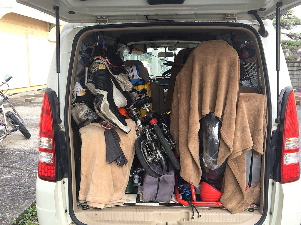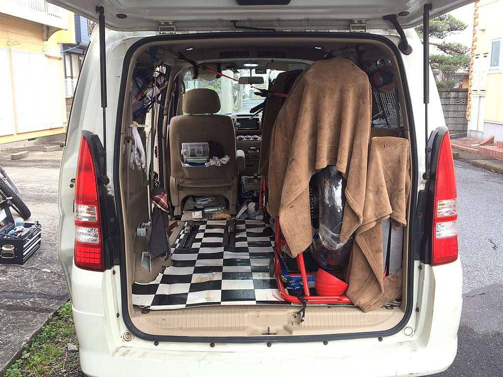 降ろす場所がないのでVFRももちろん積んだままだし、2列目左側のシートが着いてて、サーキット走行に持ってく道具も全部載せたまま。