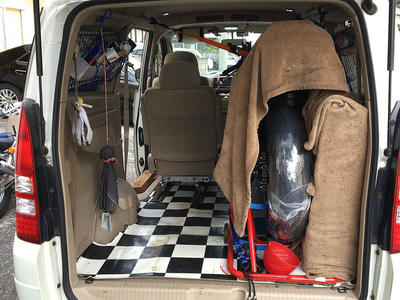 引き上げに行く時もシートを外さなくてもモンキーは載ると思ってたのだけど、ついでにもう1台積んでくる予定だったので一応外しておきました、と。
