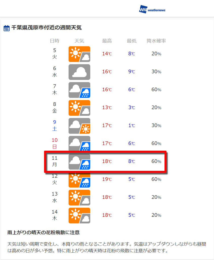 最近週末に天気が崩れることが多いもので、来週の月曜はどんなもんだかな…と、ウェザーニュースのサイトで茂原付近の週間天気予報を覗いてみましたところ…