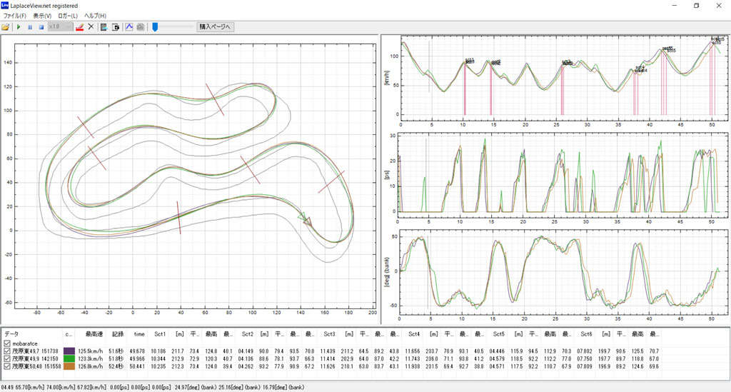基本的に自分の走行を見返す時、僕の場合はGPSのデータと車載動画を努めて客観的に見比べて行くのだけど、最高速が出てる周が良いタイムとは限らないし、色々試してる最中のデータは同じようなタイムでもタイムが伸びてるポイントが全く違うことが良くある。