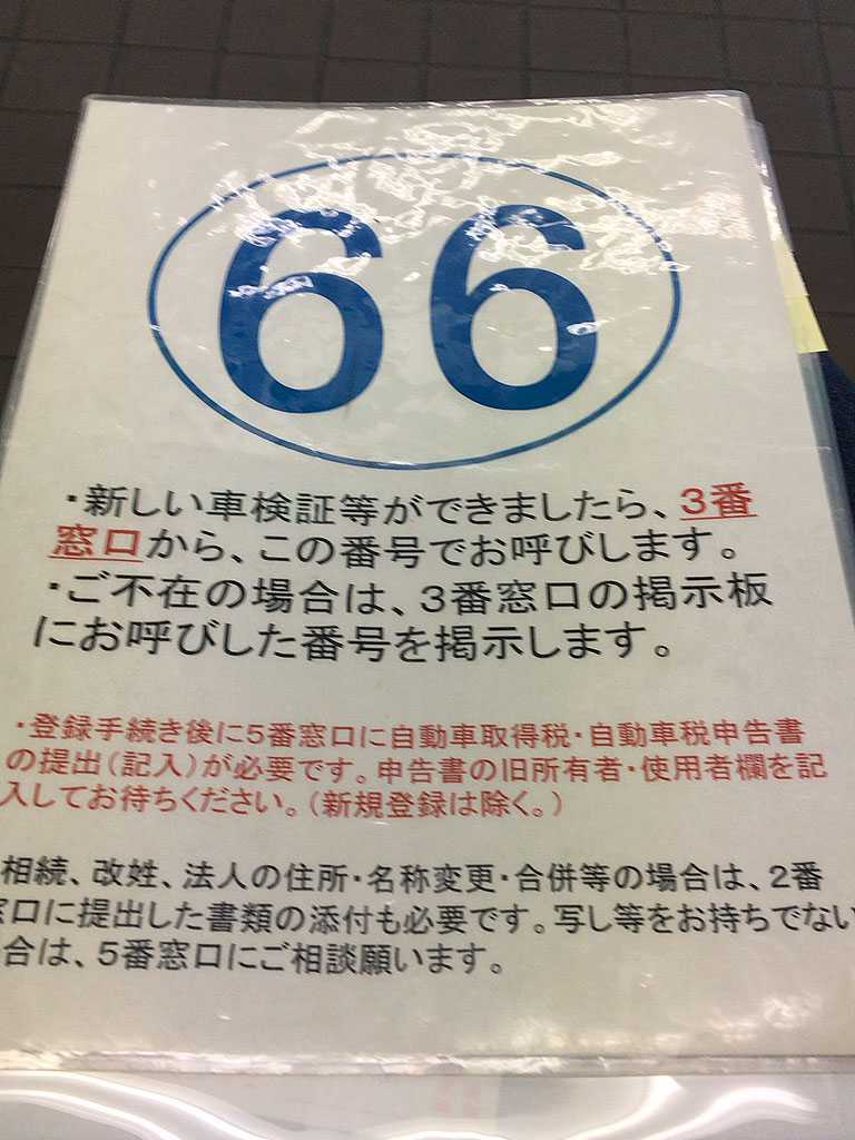 また紙を貰って車検証の情報を元に必要事項を書いて手続き後、同じ建物の別の窓口へ。
