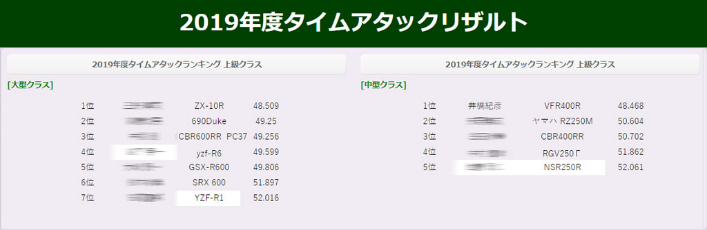ところで、先日の茂原モトブレイクのタイムアタックについてなんですけども、何がどうなっているのやら、僕のVFRは中型クラスのはずなのに大型クラスとしてランキングページに表示されてたんですよね。