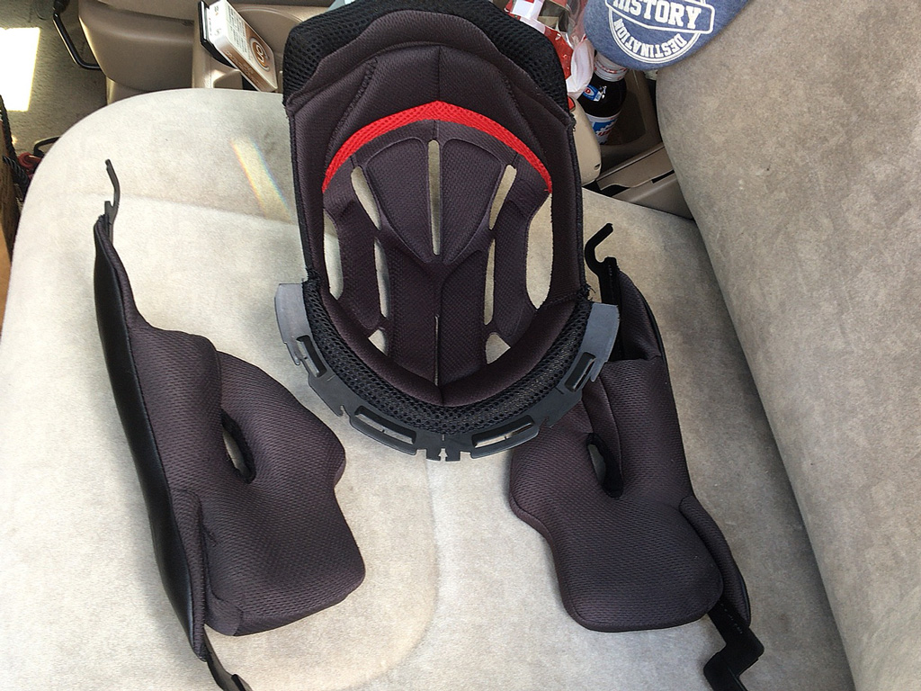 普段サーキット走行後はツナギのインナーを取り外して洗濯するのと、グローブは全部の走行終了後にミンクオイルを擦り込んでおくっていうのを必ずするんですけども、今回6月に走ったあと表面だけ拭いてヘルメットバッグに入れて社内に入れっぱなしだったヘルメットが、最初にかぶった時にちょっと臭くてテンション下がったので、やっぱり汗をかきすぎるシーズンはヘルメットの内装も洗ってやった方が良いよな…せっかく外れるんだし…とか。
