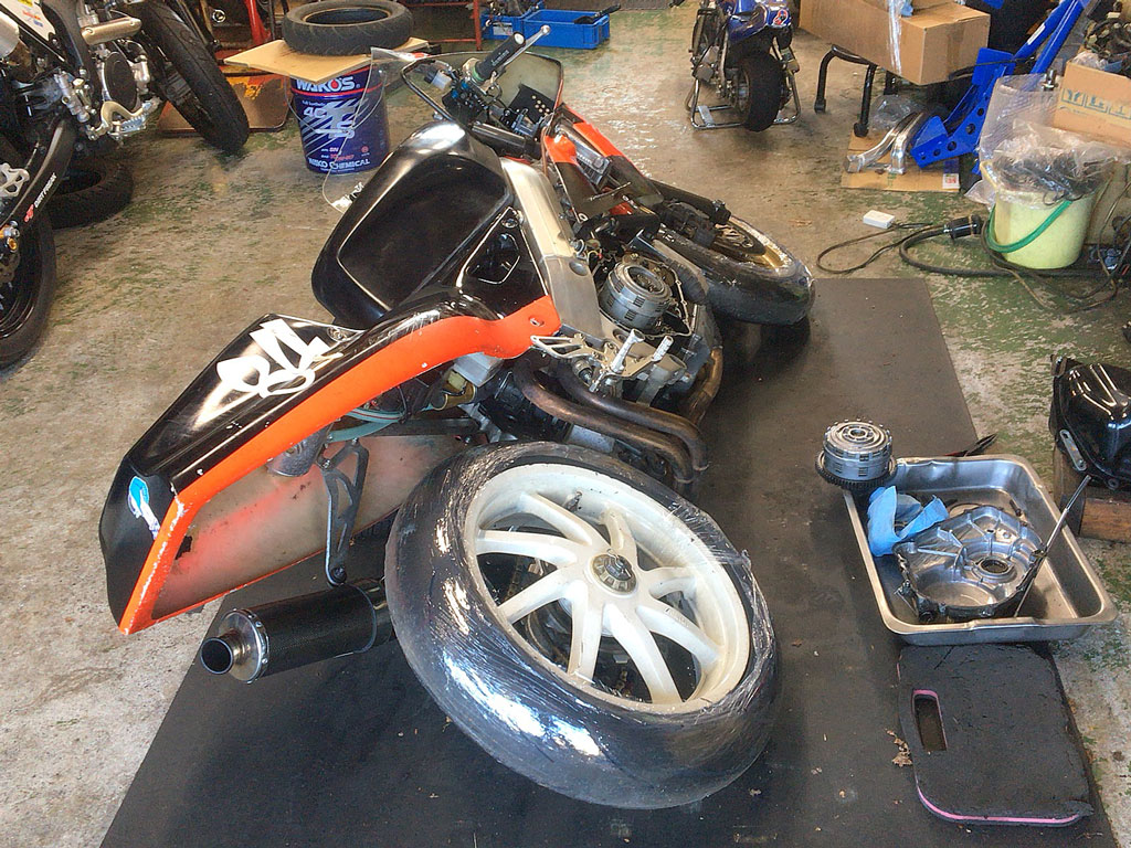 そんなこんなでクラッチのケーブルもVFRのじゃないのが加工して着いてたようなのでTカーから持ってきたり、アジャスターは社長が何処にしまったかうっかり忘れたので姫2号のNS-1から内緒で強奪してきたりして、準備完了。