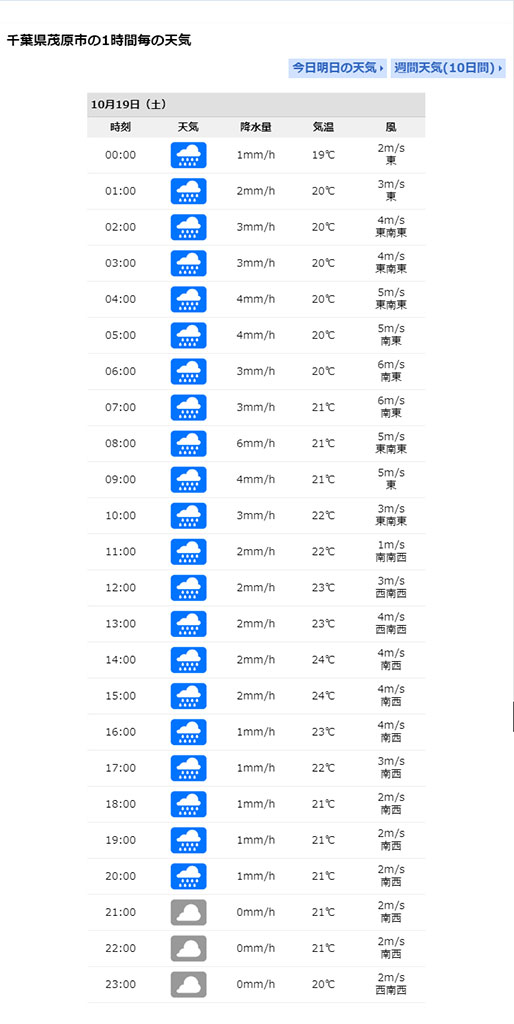 信頼度が最も高い天気予報サイトのひとつとの呼び声の高いウェザーニュースのサイトで、今明日の茂原の予報を見てみたらば。