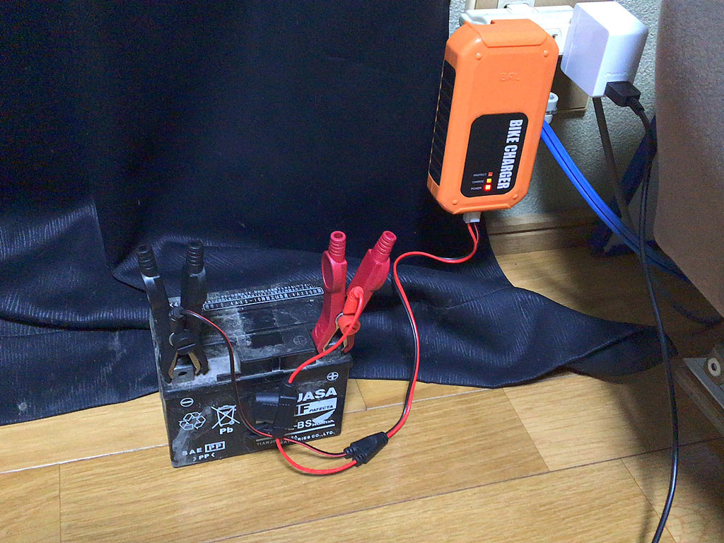 そんな訳でMolletを動かそうっつぅことで、きっとこの状態からキックでエンジンを掛けようと思ったら、汗をかきすぎて3キロくらい体重が減ってしまいそうなので、まずは恒例っつぅか儀式的なバッテリー充電からだf(^_^;)