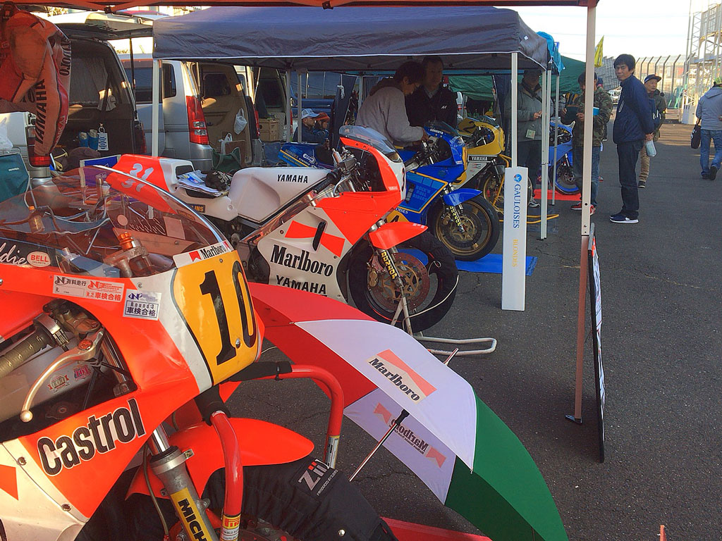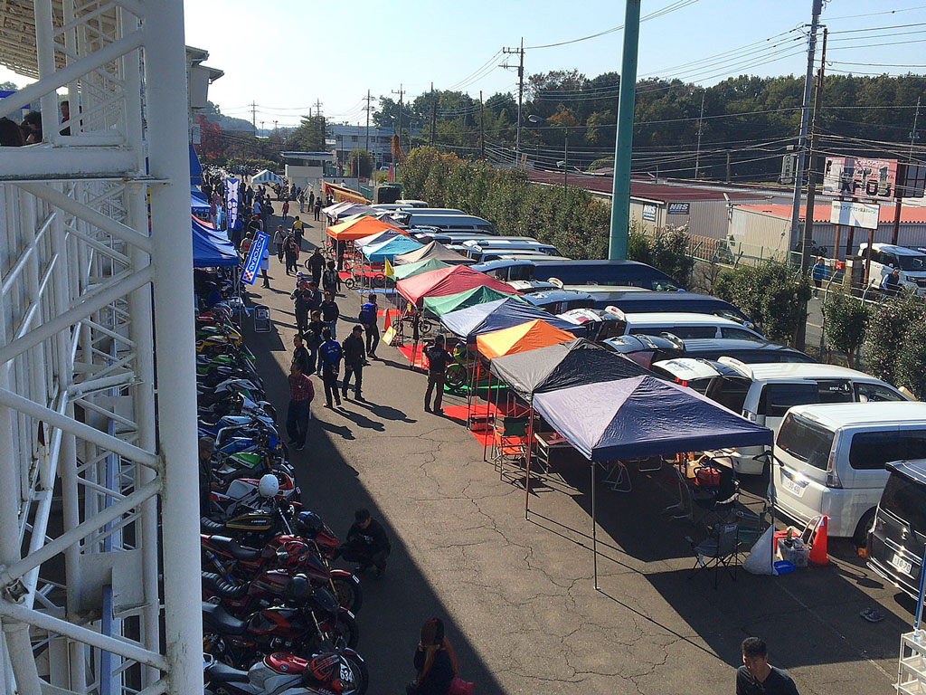庶民派草レーサーの自分としては、テイストとかツーリストトロフィとかってTC1000の入口の方の駐車場から荷物をゴロゴロするイメージなんだけど、なんとRRRクラスになると、メインゲート入ってすぐ左に専用スペースが確保されていて驚きです。