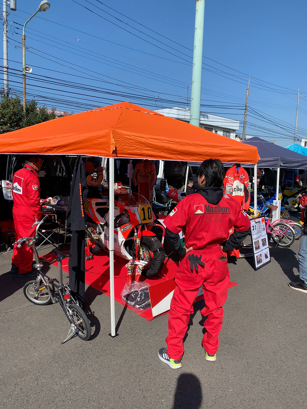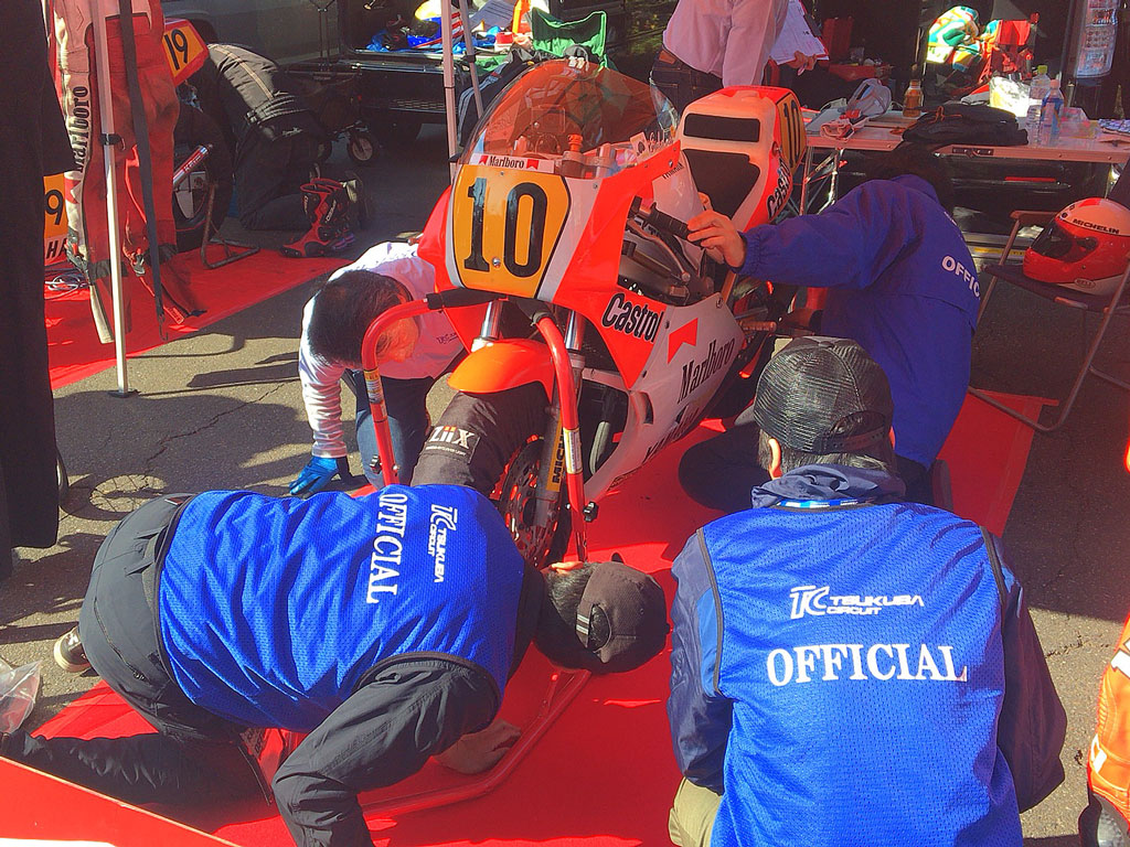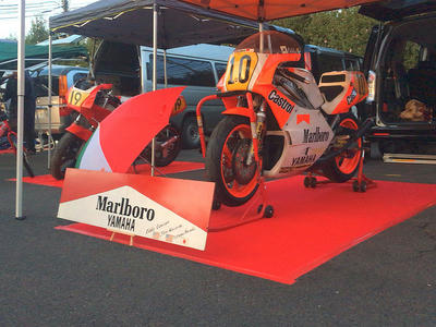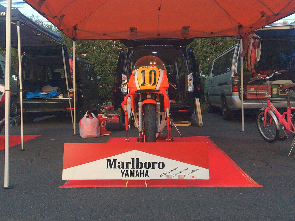 そそくさと設営を開始し、ミスターエディのYZR500をトランポから降ろすという名誉ある大役を仰せつかりました!