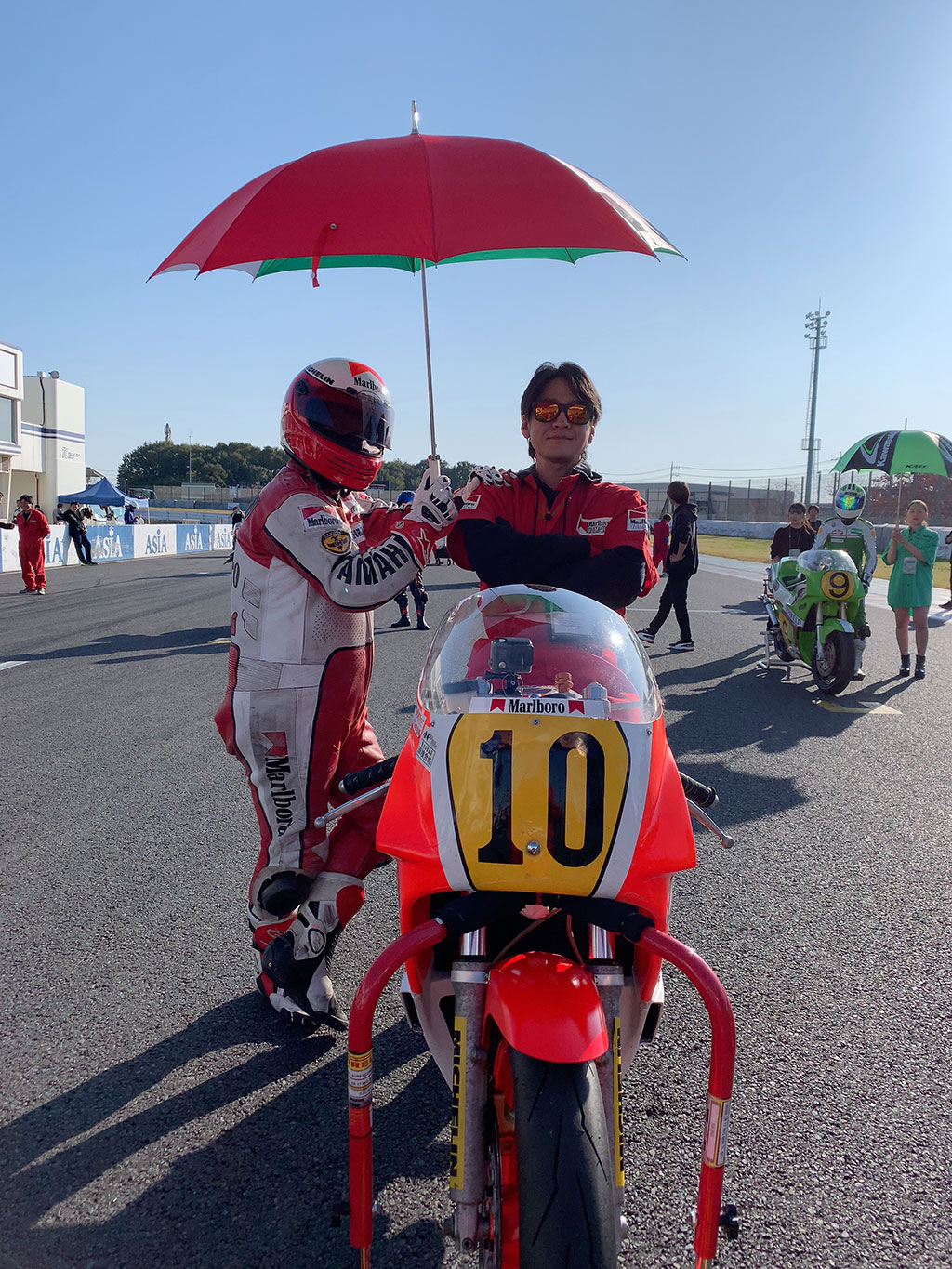 っつぅことで、ミスターエディが集合写真とか撮りに行っていていないうちに、同じくピットクルーに召集されていたししまるさんに、『エディがいない内にちょっとYZR500に勝手に跨って写真撮りたいんで撮影して!早く!!あ、ちょっとそこの人、雰囲気出したいんで傘さしてもらって良いですか!?』と記念撮影!