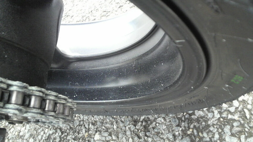 ここでふとチェーンの様子を見ると、かなり念入りに拭き取ったにも関わらずチェーンオイルが白い飛沫のようにホイールに飛び散ってますね。