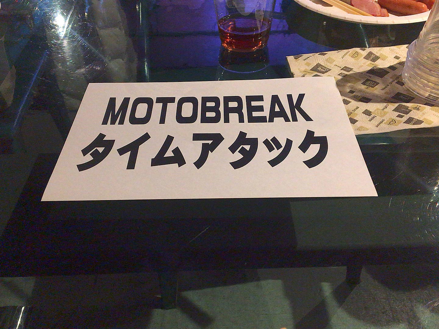 が、良く見てみると、何やらちょっとしたVIP席みたいな6人掛けのテーブルみたいなところに誰も座っていなくて、それとなくテーブルを見てみると、MOTOBREAKタイムアタックって書いてある!!