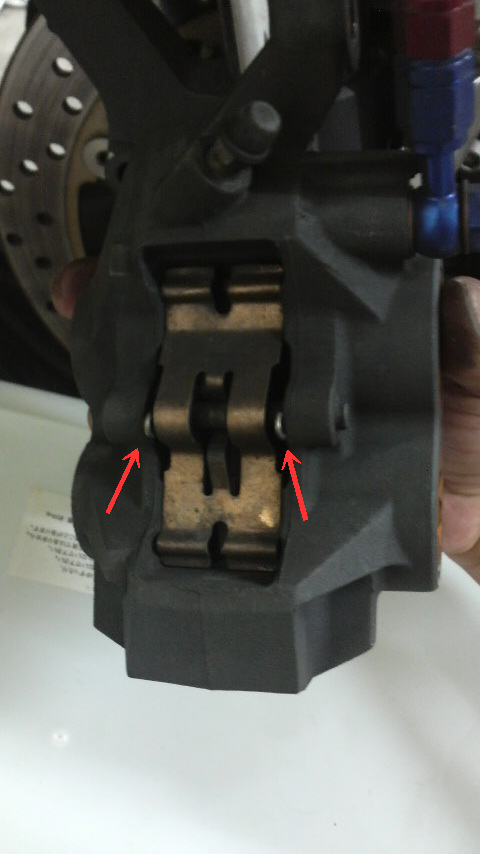 R1のフロントキャリパーは下の画像の矢印のトコのピンを2つ外すと、プレートをグイッと押しながらパッドを止めてる棒が引き抜けるんで、この棒が抜けるとパッドがスルッと取り外せるんですけど、この棒がパッドの削りカスと古いグリスで固着してて、プライヤで挟んで結構な力が必要でした。