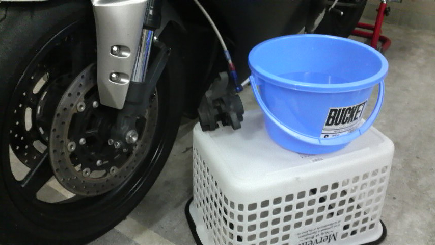 それから、ブレーキホースに負担を掛けないために外したキャリパーは針金で吊るって良く見掛けるんですけど、手頃な針金がなかったのと、お湯の入ったバケツを良い感じの高さに持ち上げるのに使ったバスケットが良い感じの高さだったんで、キャリパーもそこに置いちゃってバッチリ負担が掛からないっていう一石二鳥な感じで。