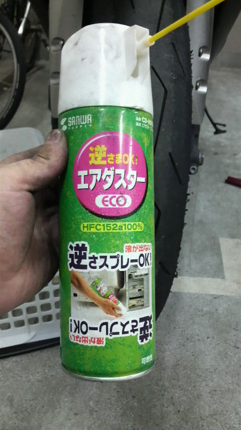 これはパソコンとかデスク周りのホコリを飛ばすのなんかに使うエアーのスプレーなんですけど、本格的なエアーツールとかを持ってるって訳でもないし、キャリパーの水気くらいならこのスプレーでも充分すっ飛ばしてくれるんで便利なんですよ。そんなに高いもんでもないし。