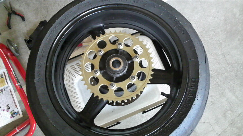 で、前編で前後スプロケのナットを予め緩めてからリアホイルを外して、ダンパーにシリコングリスを塗って戻したトコまで書いたんですけども、ホイルが外れたらまずはスプロケの交換ですよね。