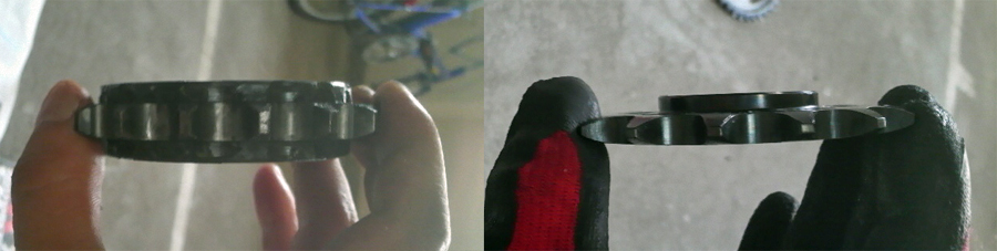 左がノーマル16Tで右がサンスターの520コンバート15T。明らかにゴツさが違う。